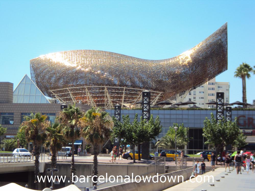 The fish statue was built for the 1992 Barcelona Olympics. The gold-coloured steel structure serves as a canopy for the casino and restaurants, which link the luxurious Hotel Arts to the seafront.